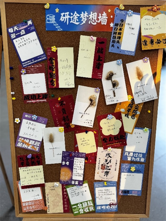 “心愿上墙”活动中,同学们在特制的卡片上,郑重写下自己的目标、梦想、期许。“金榜题名”“平稳发挥,无愧于心”“奔赴山海,未来可期”……一句句真挚的话语,承载着青春的重量与热望。这些心愿卡被同学们亲手贴于专设的“心愿墙”上。五彩的卡片逐渐汇聚,拼贴出一幅绚烂的梦想画卷。