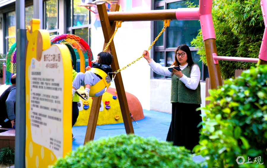 徐汇区康健街道党群服务中心外的口袋公园,家长带着孩子荡秋千。(李相如摄)