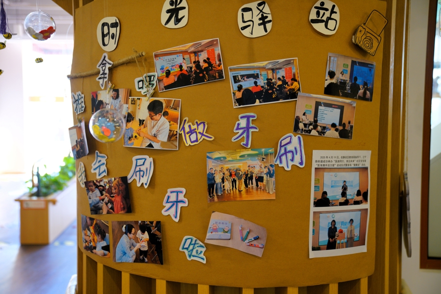 静安区江宁路街道社区综合为老服务中心二楼,宝宝屋门口贴着很多活动照片。(李相如摄)
